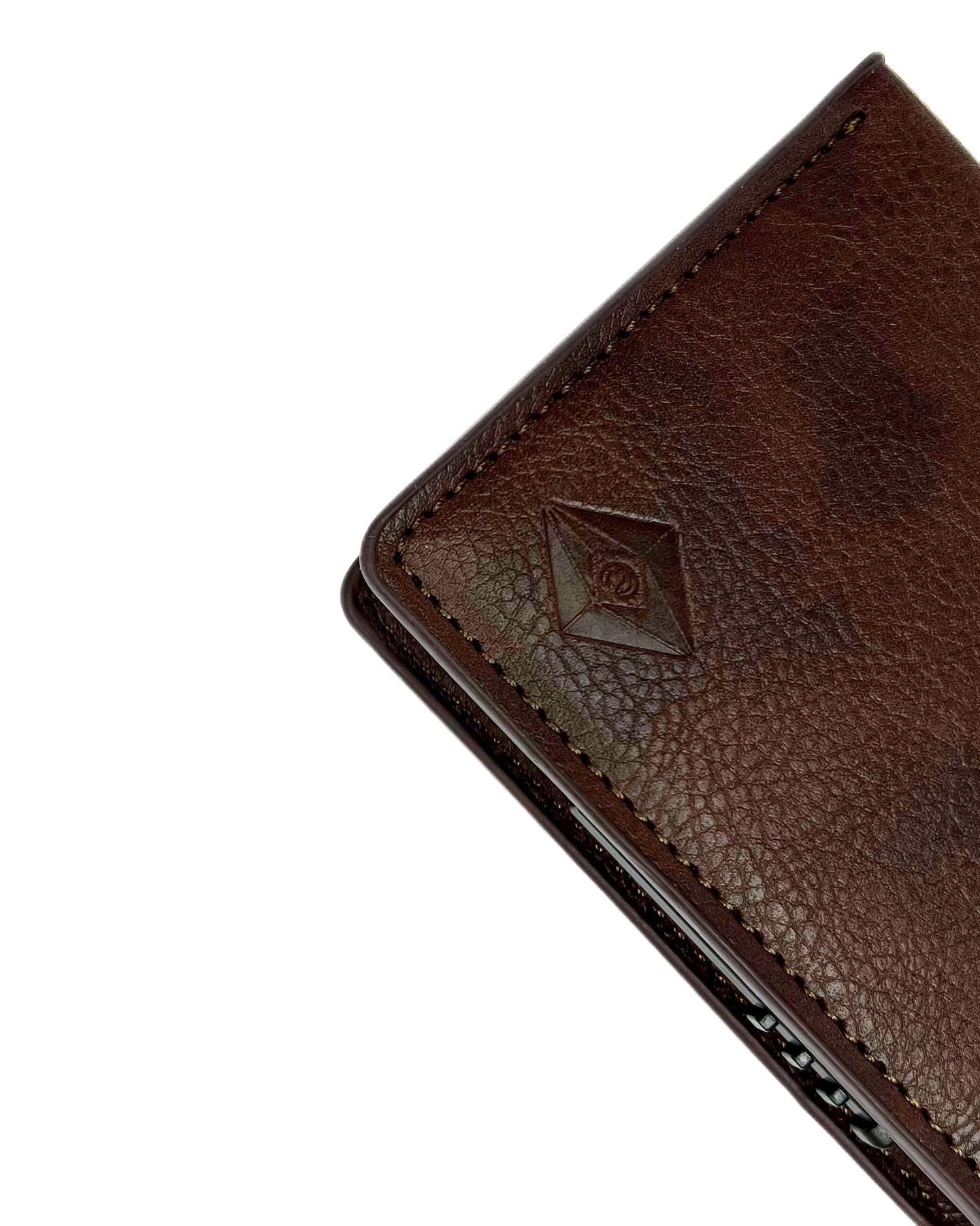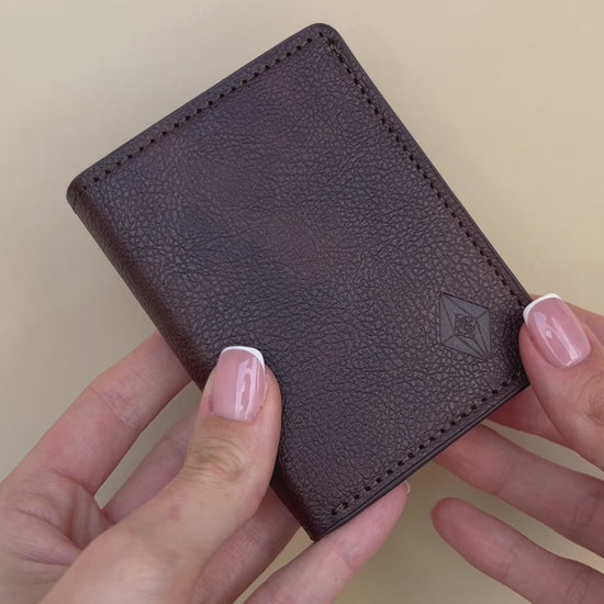 Wallet holder izrađen je od najkvalitetnije EKO kože i najpribližniji je modelu klasičnog novčanika. U holder staje 7 kartica u aluminijumski deo i dodatne dve u pregradu sa unutrašnje strane, osim toga sadrži i poseban odeljak za novac. Model je zaštićen RFID blokatorom koji sprečava neželjeno skidanje novca i ličnih podataka sa platnih kartica. Dimenzije holdera su 10,4cm x 7,9cm.